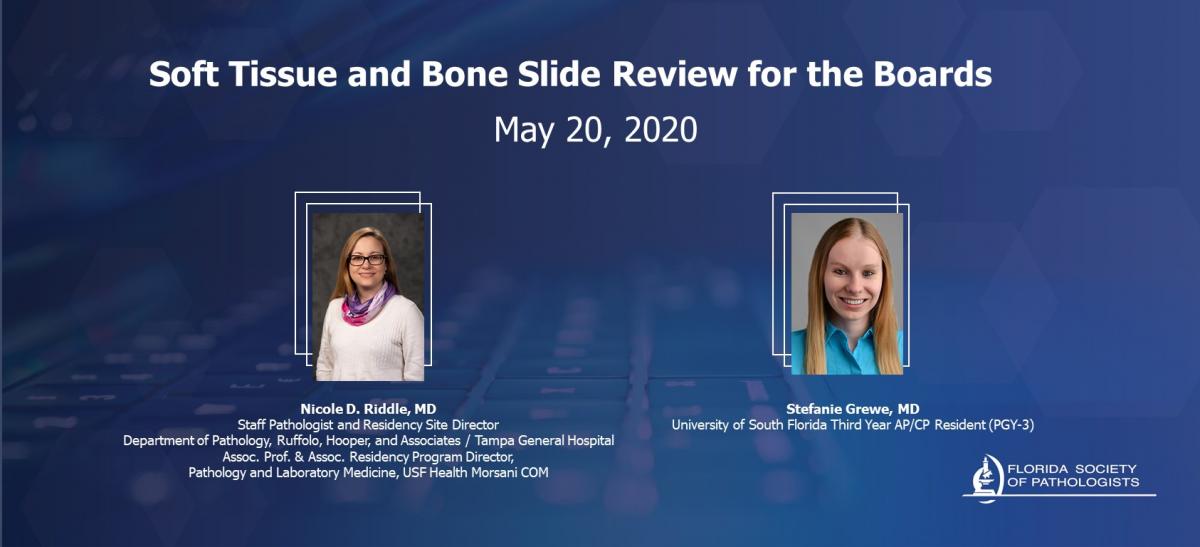 The Florida Society of Pathologists hosted Nicole D. Riddle, MD and moderator Stefanie Grewe, MD for a slide review on Soft Tissue and Bone Pathology. This informative slide review is not only an excellent resource for residents preparing for the boards but it is a practical slide review for pathologists interested in bone and soft tissue pathology. Dr. Riddle reviews 8 high yield diagnoses for bone and soft tissue pathology during this 40 minute webcast.
